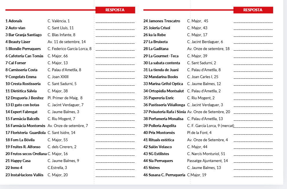 - Les respostes s'han d'escriure correctament en català al costat del nom de la botiga que correspongui.
