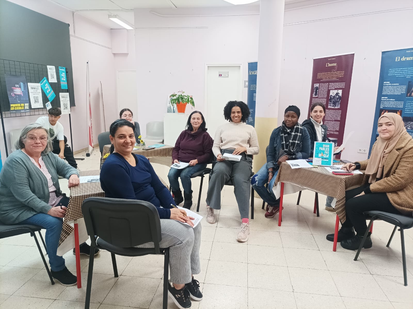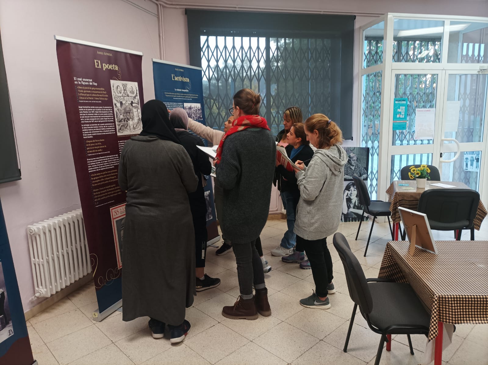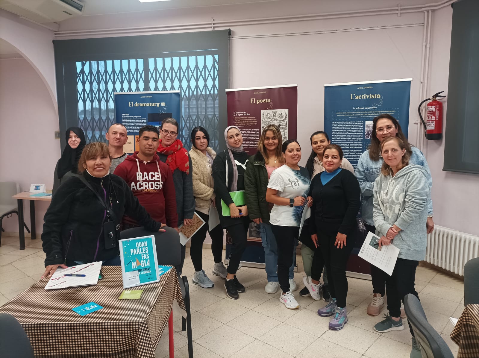 Els alumnes de Bàsic 1 i Bàsic 2 van pujar les escales que separen l’aula de català de la Sala Mogent per fer una visita llampec a l’exposició. Per parelles van haver de trobar en els plafons explicatius les respostes d’un qüestionari breu. La visita la van fer en la segona hora de classe i en la classe següent, a tall d’activitat d’escalfament, van poder fer un breu exercici de conversa sobre les activitats d’oci: el teatre, el cinema i la música. Una conversa guiada que va resultar molt interessant i en la qual els alumnes van aportar títols de pel·lícules, van comentar quins eren els seus actors preferits i quina música els agradava escoltar. Tothom va valorar positivament haver conegut la figura d’Àngel Guimerà.