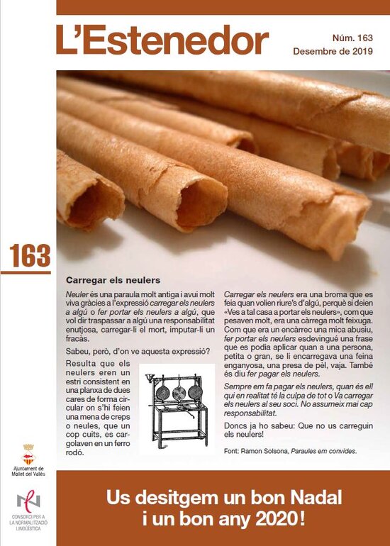 L’Estenedor, revista virtual de llengua catalana Carregar els neulers Consultes Anar de vint-i-un botons. Trenca. Malles. Leotards. Fraseologia relacionada amb el fred L'endevinalla Què vol dir tiberi? Webs Trobareu una recepta de neules (sense neulers) a la Gastroteca.