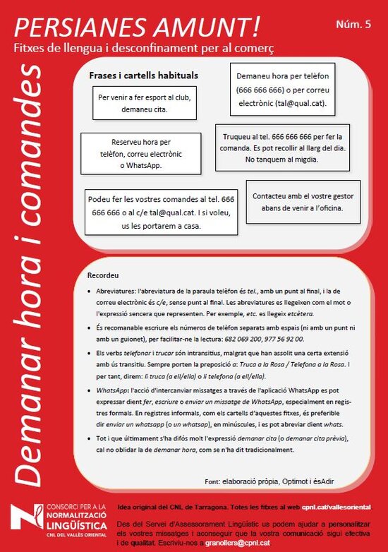 Número 5 de la sèrie de fitxes dedicades a donar consells i models per a la correcta redacció dels cartells informatius que l'actual situació de desconfinament ha fet tan habituals als aparadors dels establiments.