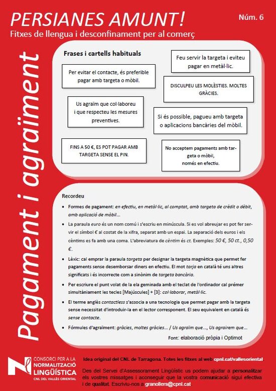 Número 6 de la sèrie de fitxes dedicades a donar consells i models per a la correcta redacció dels cartells informatius que l'actual situació de desconfinament ha fet tan habituals als aparadors dels establiments.