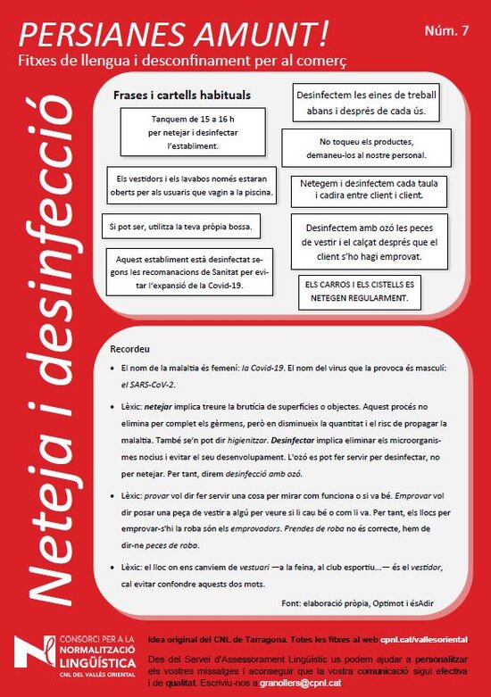 Número 7 de la sèrie de fitxes dedicades a donar consells i models per a la correcta redacció dels cartells informatius que l'actual situació de desconfinament ha fet tan habituals als aparadors dels establiments.