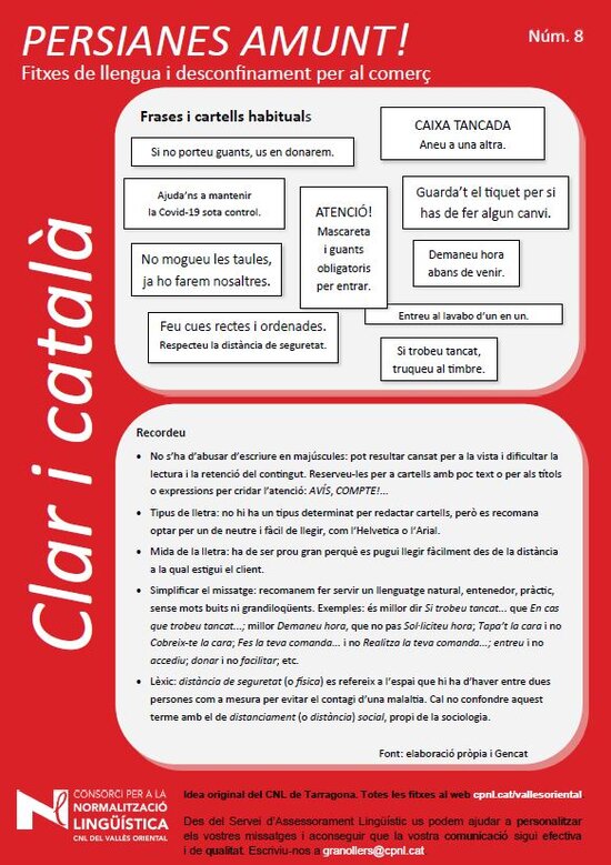 Número 8 de la sèrie de fitxes dedicades a donar consells i models per a la correcta redacció dels cartells informatius que l'actual situació de desconfinament ha fet tan habituals als aparadors dels establiments.